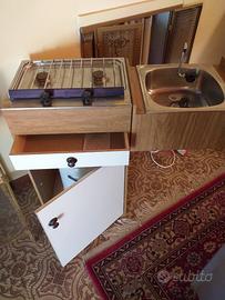 Mobiletto apribile con lavello in acciaio e piano cottura a 2 fuochi, misura chiuso 44 x 35 alto 104, aperto largh. 88, con 1 antina e 1 cassetto.