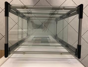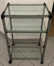 Vendo mobiletto con 4 ripiani in vetro 36x48 che appoggiano su 4 ventose per piano. Il materiale é in ferro grigio e plastica nera e appoggia su 4 ruote. Le dimensioni sono: 52 x 38 H 87,5 Visto piaciuto. No perditempo.