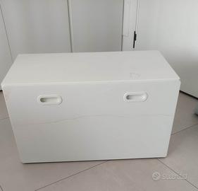 usato per custodire giocattoli e come ripiano. il cassone ha le rotelle per muoversi avanti/dietro. presenta solo delle parti dove si vede il legno nella parte interna non in vista. vendo a 25€