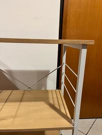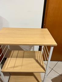Mobiletto in metallo bianco con ruote, dotato di 3 ripiani in legno color rovere. Misure (L x P x H): 60 x 40 x 89 cm (Il ripiano superiore presenta un piccolo difetto superficiale, si veda foto)