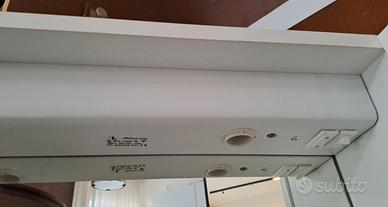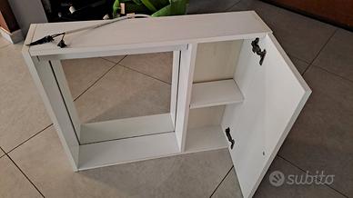 Mobiletto bianco con specchio e un'anta laterale apribile con ripiano interno. Dimensioni : larghezza 67, cm altezza 58 cm, spessore max 15 cm. Con cavo per alimentazione luce davanti allo specchio