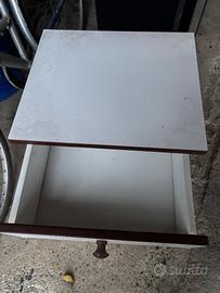 Piccolo mobiletto bianco con cassetto, compatto e versatile. Ideale come complemento in camera, ingresso o soggiorno, offre un pratico spazio contenitivo.