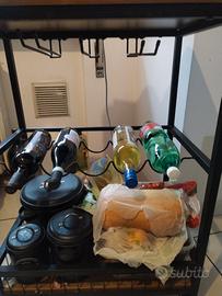 Vendo mobiletto portatutto per cucina in ferro e legno con portabottiglie e ganci per appendere frutta o altro. Praticamente nuovo. Misure in descrizione