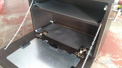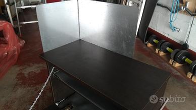Vendo mobile cucina da campeggio costruito artigianalmene con ripiano interno. Gambe anch'esse fatte artigianalmene in acciaio verniciato con inserti in alluminio rimovibili con supporto sullo schienale del mobile. Paravento in acciaio zincato. Rimovibili e riposti sull' anta all'interno. Misure 60 lunghezza 30 profondità e 40 altezza. Sulla parte inferiore ci sono due supporti in teflon per poterli fare scorrere su un piano All'interno del furgone o macchina. Sul fondo ce una cava per vite M8 per poterlo fissare . Il prezzo è leggermente trattabile