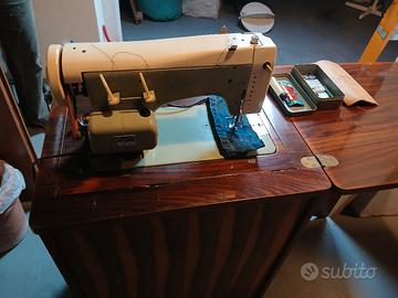 vendo mobiletto + cucitrice + istruzioni + scatola con piccolo kit per cucire. la cucitrice e sia elettrica che manuale manca la cinghia per manuale ,fissa a terra no rotelle .