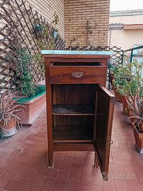 Splendido mobiletto da bagno antico, risalente ai primi del ’900, realizzato in legno massello con un elegante piano in marmo bianco. Un pezzo autentico e di grande fascino, perfetto per aggiungere un tocco vintage e raffinato al tuo bagno.