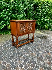Splendido mobiletto d’entrata in stile con intagli rappresentanti elementi decorativi di tipo vegetale e animale. Il mobiletto poggia su quattro graziose colonnine tornite. Si presenta con due sportelli all’interno dei quali trova posto un comodo ripiano. Ideale per accompagnare arredamenti di carattere o per progetti di tipo shabby chic. Dimensioni Cm 88x36x87h.