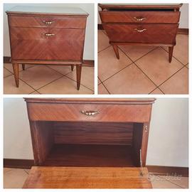 Mobiletto Design Anni '44 - Modernariato Italiano in Mogano e Vetro Retroverniciato. Struttura solida in Mogano. Il frontale presenta una raffinata lavorazione "a macchia aperta" con venature disposte a spina di pesce (chevron), che crea un motivo geometrico naturale unico.