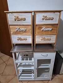 mobiletto con ripiano in acciaio piu ripiani vari uno e' porta bottiglie, cassetto e antina trasparente