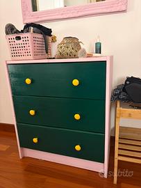 Mobiletto in legno dipinto a mano Rosa verde e giallo Il piano ha delle macchie, andrebbe riverniciato o messo un piano sopra 60 larghezza 35 profondita