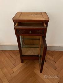 Biglietto in legno con cassetto e e anta. Ripiani, pareti laterali e anta in vetro. Il piano in marmo superiore è semplicemente appoggiato e quindi facilmente rimovibile.