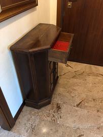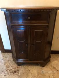 Mobile angolare in legno massello, noto anche come angoliera o mobiletto ad angolo, tipicamente in stile arte povera o antico. È progettato per adattarsi a un angolo della stanza, massimizzando l'uso dello spazio. Il mobile è realizzato in legno massello, probabilmente noce o un legno simile con una finitura scura.