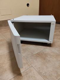 Vendo mobiletto in metallo con anta a chiusura magnetica, dotato di 4 ruote per un facile spostamento e piedini di posizionamento per mantenerlo stabile.