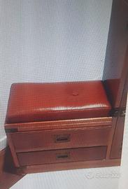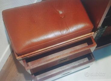 Mobiletto in mogano in stile MARINA con 2 cassetti, 1 anta e ripiani, con sedile in finta pelle, bottoni mancanti alcuni, adatto a diversi ambienti.