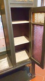 Grazioso mobile con scaffali interni, sportelli con vetri colorati, specchio centrale, e ripiano inferiore a piena larghezza.