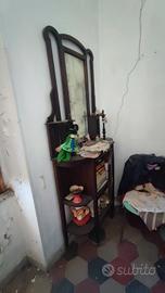 Elegante mobiletto d’appoggio a parete in stile Liberty, risalente ai primi anni del Novecento. Il mobile si distingue per una raffinata specchiera verticale originale, incorniciata da una struttura in legno a linee curve tipiche dell'Art Nouveau. La base è funzionale e ben articolata, dotata di un vano centrale a sportello e mensole laterali a giorno su più livelli, ideali per l'esposizione di piccoli oggetti o corredi. La struttura poggia su eleganti sostegni torniti e si presenta in buone condizioni generali, con tutta la solidità del legno massello dell'epoca. Un complemento d’arredo versatile e di grande impatto estetico, perfetto per ingressi, disimpegni o camere da letto che necessitano di un pezzo di carattere storico.
