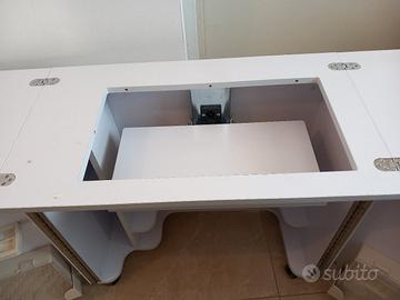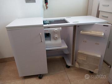 grande apertura per adattarsi a macchina da cucire standard. il sollevatore idraulico a tre posizioni. si chiude in uno spazio compatto per adattarsi a qualsiasi stanza quando non in uso ruote piroettanti frenanti,,ripiani e contenitori per ago filo......chiuso :lung. 77, aperto:154,alt.70.prof:44