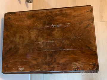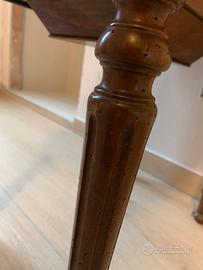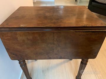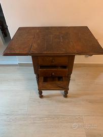 Vendo tavolino allungabile in legno della prima metà ‘900 con due cassetti e scomparto segreto. Profondo 52 cm largo 38 (chiuso) o 72 (aperto), alto 64 cm.