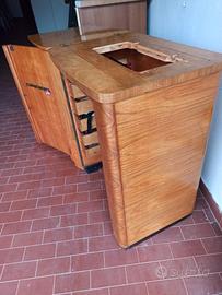 Mobiletto degli anni '50 impiallicciato in radica, con piano a scomparsa per ritirare la macchina da cucire e permette di ruotarla sul piano da lavoro, sempre pronta all'uso.