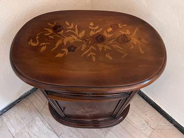 Mobiletto ovale legno intarsiato e motivi floreali