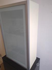 Mobiletto Ikea Vattern, colore bianco con sportello con bordo grigio e vetro satinato. Dimensioni: altezza 67, larghezza 40, profondità 21. Buone condizioni, solo qualche piccolo segno di usura nei ripiani di metallo interni e nella cornice dello sportello (vedi foto).