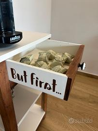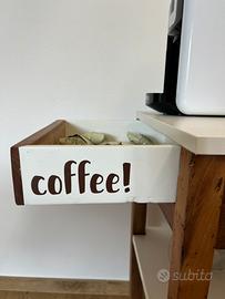 Mobiletto per la macchina del caffe, cassetto porta cialde, ganci per appendere le tazzine. Zuccheriera inclusa, tazze e macchina del caffe NON incluse. Misure 35 x 42 x 75 cm (altezza).