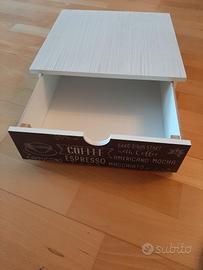 Mobiletto porta capsule in legno decorato, stile coffee bar americano. Ideale come elemento d’arredo, in cucina organizzare capsule, bustine da tè o in stanza.
