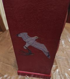 Mobiletto in legno a tre cassetti, ideale per riporre bigiotteria e piccoli oggetti. Presenta uno specchio nella parte superiore. Misura altezza cm 23, profondità cm 10 e larghezza cm 14 ½.Tre cassetti con maniglie decorative, finitura in vernice rossa vivace. Un cassetto leggermente rovinato internamente. Decorazioni con uccelli