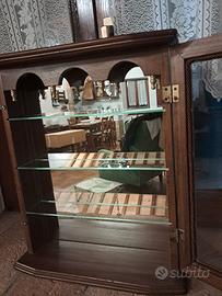 Delizioso mobiletto molto ben rifinito in legno di noce e sportello con bordura marrone ( vedi foto particolare) come nuovo, usato pochissimo per contenere piccoli oggetti di Swarovski. È possibile mettere all interno anche striscia led al ripiano piu alto per esaltare tutti gli oggetti perché i ripiani sono in vetro. Misure larghezza 41 cm altezza 49 profondità 12 cm.