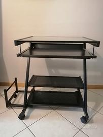 Mobiletto porta computer (torre, tastiera, mouse, schermo), in metallo colore nero, piano superiore in vetro trasparente. Secondo piano estraibile per uso tastiera e mouse. Piano intermedio per stampante ed inferiore per deposito fogli ed accessori. Parte laterale estraibile per alloggiamento torre pc.