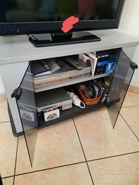Design moderno, colore grigio, su ruote quindi si sposta facilmente, con due sportelli in vetro fume'.