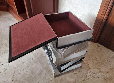 Mobiletto portaoggetti colore nero, bianco e argento, molto particolare, formato da una struttura che sembra costituita da 5 grandi libri messi uno sull’altro con i nomi delle città, ha due vani contenitore foderati all’interno. Misure 28x23 cm. Ottime condizioni.