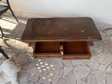 Vendo un mobiletto basso tutto in legno noce da restaurare verniciatura ,ottimo per salotto divano.