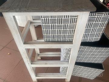 Vengo pratico mobiletto multiuso in stile Shabby Chic, perfetto per chi cerca una soluzione salvaspazio elegante e funzionale. Ideale per il bagno, la camera da letto o l'ingresso.Struttura: Legno con finitura bianca e top superiore a contrasto effetto legno scuro.Cassetti: 3 ampi cestini estraibili con motivo geometrico intrecciato (bianco e marrone) e pomelli decorativi.Condizioni: Ottime/Pari al nuovo: Perfetto come portatutto, scarpiera leggera o mobile da bagno per asciugamani e accessori.Misure indicative:Altezza: 63 cm circaLarghezza: 25 cmProfondità: 30,5cm