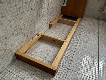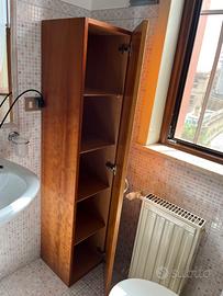 Mobiletto sotto lavabo bagno 3 sportelli e ripiani interni, con colonna e base in legno colore ciliegio. Larghezza mobile 100cm altezza 63 cm profondità 35 cm; colonna altezza 154 larghezza 33 cm profondità 35 cm; base lunghezza 133 cm altezza 6cm profondità 35 cm