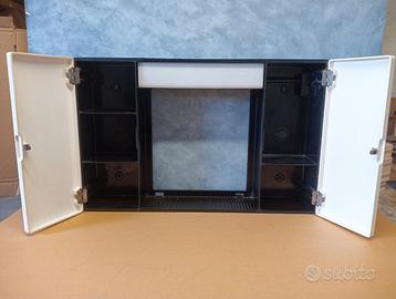 Vendo mobiletto vintage anni 70 per bagno con specchio da sostituire, porta lampadine e interruttore + presa in buone condizioni, le misure sono cm. L66,5 x H42 x P12,5 larghezza anta 16,5, preferibile ritiro a mano