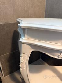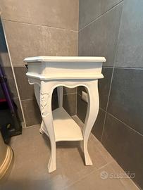Vendo elegante mobiletto in stile classico/shabby chic, colore bianco, con un cassetto superiore e ripiano inferiore. Linee sinuose, gambe sagomate e dettagli decorativi intagliati che lo rendono raffinato e senza tempo.