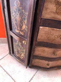 Antico mobiletto in legno di Banano, con decori. Privo di un solo pomello, facilmente sostituibile. 67 lunghezza x 36 profondità. Altezza 64