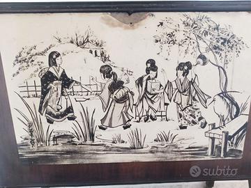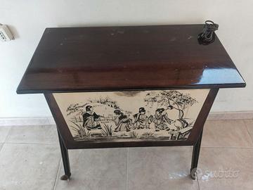 Mobile vintage anni 50/60 utilizzato come mobile bar e porta giradischi/TV. Presenta un decoro frontale con immagini dell'Oriente. È dotato di rotelle per gli spostamenti. Ha la predisposizione per luce interna. È tutto originale con segni di usura sull'apertura e sull'illuminazione. Ritiro in presenza