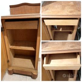 Mobiletto multiuso vintage modello tipo comodino alto con anta e all'interno cassetto nascosto e ripiano centrale.