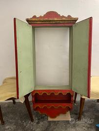 Il mobiletto vintage in stile spagnolo coloniale presenta una forma verticale slanciata con un cappello sagomato, la parte inferiore è caratterizzata da una mensola a giorno con bordi ondulati. Le ante sono divise in tre pannelli quadrati ciascuna, decorati con formelle a rilievo a forma di croce ottagonale. La policromia è l'elemento più d'impatto. Il rosso lacca accostato all'oro è una funzione decorativa importante, le "crepe" visibili sulla vernice indicano un invecchiamento coerente con una produzione artigianale non industriale e aumentano il fascino vintage. Le cerniere e il chiavistello centrale in ferro battuto sono semplici e funzionali.