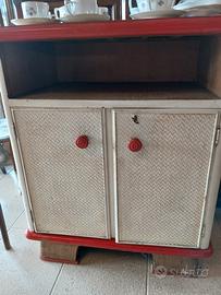 Simpatico mobiletto vintage anni '60 da cucina o qualsivoglia stanza, in legno con decori rossi con due antine , cm.63 x prof.cm.40 x h. cm.80 in buone condizioni, ritiro in loco.