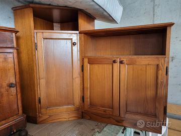 Cassettiera vintage, comodino e mobile angolare danneggiato sul retro.