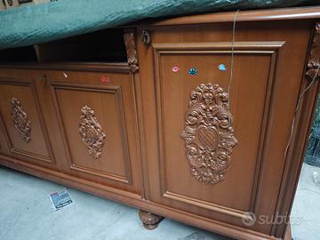 Il mobile è in vero legno, con intagli decorativi classici e finitura calda color noce.