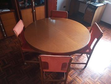 Set soggiorno scomponibile in legno massello: mobile vetrina ad angolo con cassetti, vano bar con apertura a ribalta, ripiani + tavolo circolare estendibile con set 6 sedie. Il set è stato acquistato in un mobilificio di pregio in Via delle Lame a Bologna negli anni '70