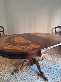 Il tavolo è in buone condizioni, comodamente allungabile per aumentare il numero di posti. Le sedie sono da ristrutturare, in quanto visibilmente rovinate.