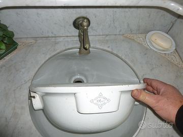 MOBILE BAGNO IN PITCH-PINE STILE LIBERTY FRANCESE PRIMI 900 CON SERBATOIO D'ACQUA A SCOMPARSA NEL NEL MARMO A CARICA DALL'ALTO, LAVABO A RIBALTAMENTO, LE MISURE SONO H 117 X L 84 X P 66