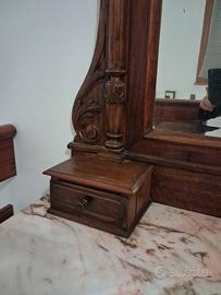 Vendo mobili antichi in legno con piano in marmo. Mobile grande con specchio e cassettinii laterali € 350 e mobile piccolo € 150. Vendita singola o in coppia. Un piedino del mobile grande e un pó danneggiato