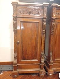 Comodini di camera da letto di noce, intarsiati a mano, restaurati di fine 800