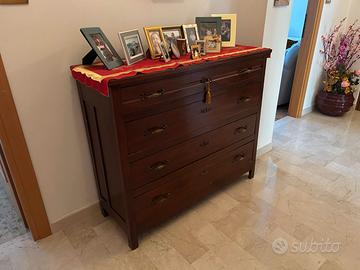 Vendo mobili di prestigio restaurati, in ottime condizioni. Cassettone in legno chiaro (122x55x99H), cassettone in legno scuro (117x43x99H), tavolino porta riviste (50x39x80H) e tavolino ad un cassetto (50x30x68H). Entrambe i cassettoni sono venduti a Euro 550,00 cadauno con tavolino (a scelta) omaggio